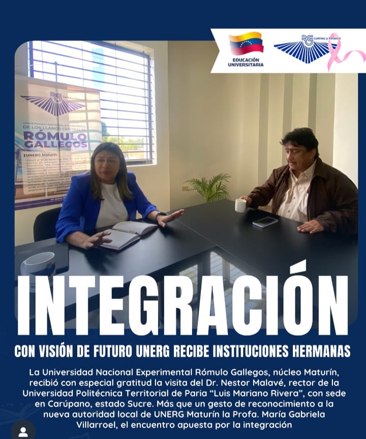 Universidad Politécnica Territorial de Paria «Luis Mariano Rivera»La Universidad Nacional Experimental de Los Llanos Centrales Rómulo Gallegos, núcleo Maturín, recibió con especial gratitud la visita del Dr. Nestor Malavé, rector de la Universidad Politécnica Territorial de Paria “Luis Mariano Rivera”La Universidad Nacional Experimental de Los Llanos Centrales Rómulo Gallegos, núcleo Maturín, recibió con especial gratitud la visita del Dr. Nestor Malavé, rector de la Universidad Politécnica Territorial de Paria “Luis Mariano Rivera”, con sede en Carúpano, estado Sucre.⠀Este encuentro, más que protocolar, fue un gesto de reconocimiento a la nueva autoridad local de UNERG Maturín la Profa. María Gabriela Villarroel, y una firme apuesta por la integración académica entre instituciones hermanas.⠀El Dr. Malavé se presenta con visión de futuro: abrir caminos que impulsen a los estudiantes hacia la concreción de carreras universitarias a través de la posible creación de un Centro Regional de Educación (CRH) en el estado Sucre, fortaleciendo así el acceso y la permanencia en la educación superior.⠀Además, se exploraron nuevas alianzas orientadas a la formación integral de los jóvenes del oriente venezolano, con énfasis en la articulación interinstitucional, el desarrollo territorial y el acompañamiento académico que dignifique el talento local.