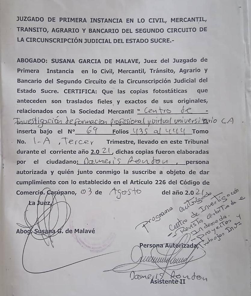 Soporte Legal y Juridico Centro de Investigación. C.I.F.P.V.U c.a. Figura Juridica Independiente. Empresa de Produccion Social Autonoma. Socio Educativa y Formativa. Fines Academicos y de Investigacion, Cientificos, creacion intelectual y de divulgacion Universitaria Profesional y Formativa. Registrada en el SAREN. APROBADA, en el registro civil autonomo. Aprobada por el Consejo Universitatio de la U.P.T.P LMR. Avalando tres programas: Independientes. Centro de Investigacion. Revista Cientifica Arbitrada e Indexada. Programa de Trabajos y Proyectos de Investigacion. Cumpliendo fines y ordenanzas juridicas legales vigente pertinentes a los fines citados.